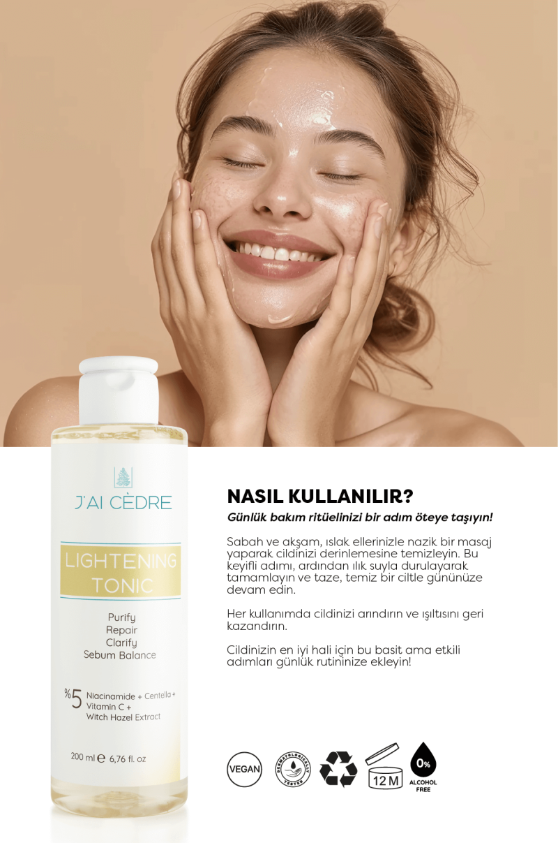 J’ai Cedre Tonik – Cilt bakım rutininizin vazgeçilmezi! Niacinamide, C vitamini ve Licorice Ekstrakt’ının mükemmel birleşimi, cildinizdeki lekelerin oluşumunu önlerken etkili bir aydınlık sağlar.